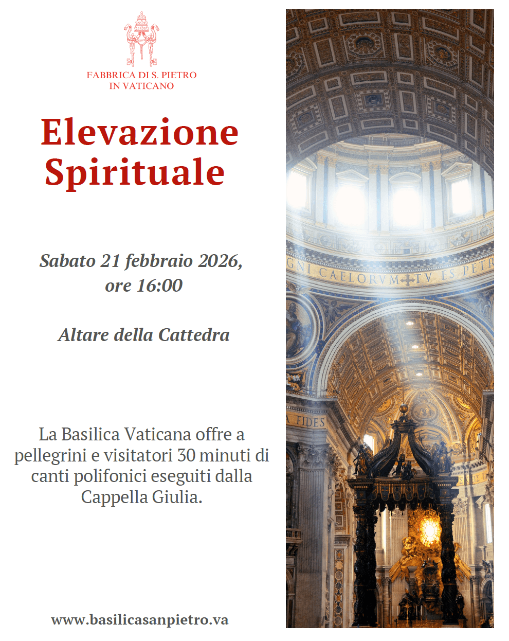 On Saturday, February 21 at 4:00 PM, St. Peter’s Basilica will host a new “Spiritual Elevation” event, a moment of reflection and sacred music open to pilgrims and visitors.