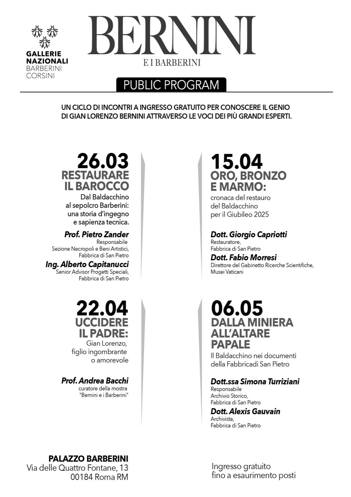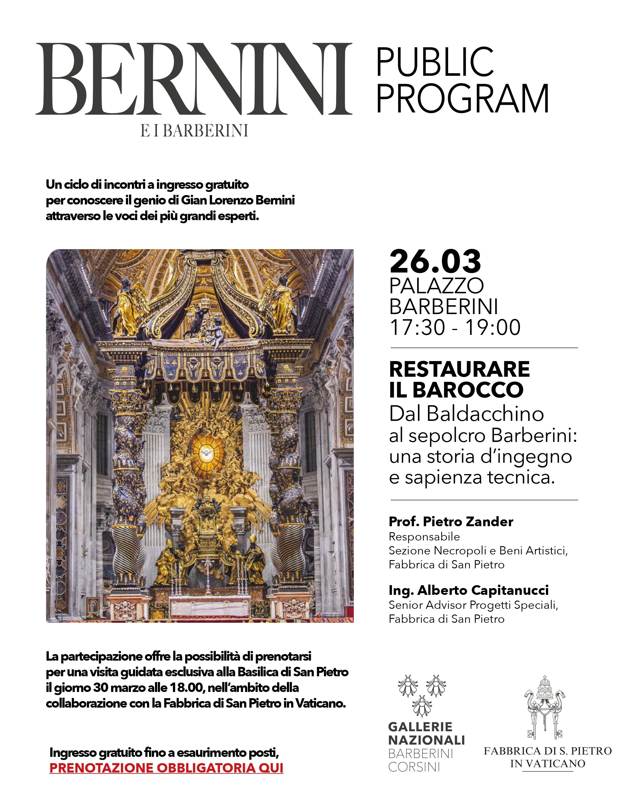 Il programma si apre giovedì 26 marzo, dalle ore 17:30 alle ore 19:00, a Palazzo Barberini, con l’incontro “Restaurare il Barocco. Dal Baldacchino al sepolcro Barberini: una storia d’ingegno e sapienza tecnica”. Interverranno il Prof. Pietro Zander, Responsabile della Sezione Necropoli e Beni Artistici della Fabbrica di San Pietro, e l’Ing. Alberto Capitanucci, Senior Advisor Progetti Speciali della Fabbrica di San Pietro.